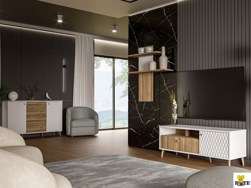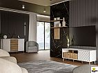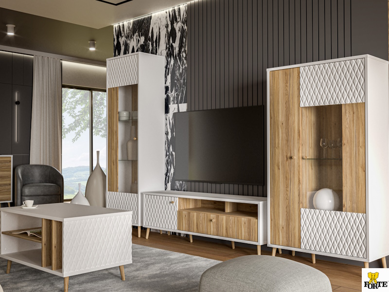 Kolekcja AKSANA to eleganckie połączenie nowoczesnego stylu z subtelnymi, ryflowanymi wstawkami na frontach, które dodają wnętrzu charakteru i głębi. Wysokie nóżki nadają meblom lekkości, a jednocześnie ułatwiają utrzymanie porządku.