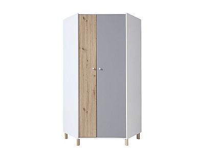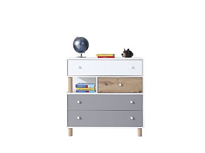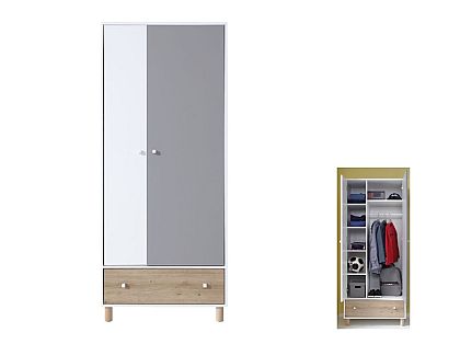 Dostępne w kolorze Biały Lux+Dąb Artisan+ szary wprowadzają ciepły i optymistyczny nastój. Dodatkowej lekkości nadają wysokie nóżki i metalowe uchwyty.