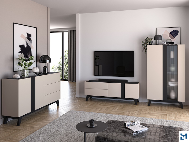 Wyrafinowany kaszmirowy kolor frontów i boków dopełniliśmy klasycznie czarną wstawką, blatem i podstawą. Stylowe nóżki dodają meblom lekkości i wyjątkowego charakteru, a bezuchwytowe fronty dodatkowo podkreślają współczesny design. Starannie wyselekcjonowane typy brył pozwolą zaaranżować wiele wnętrz, niezależnie od ich metrażu.