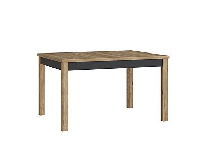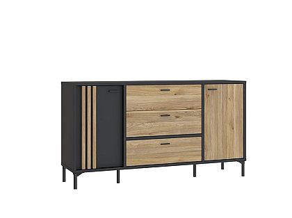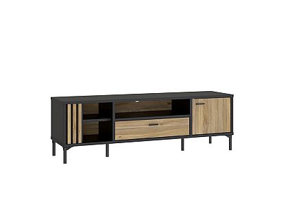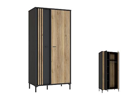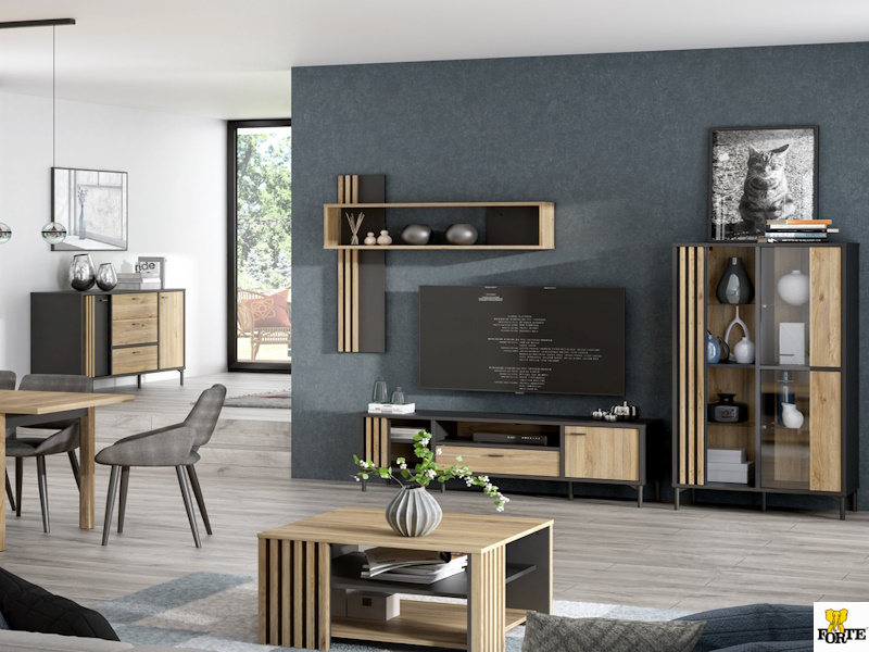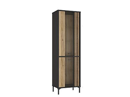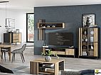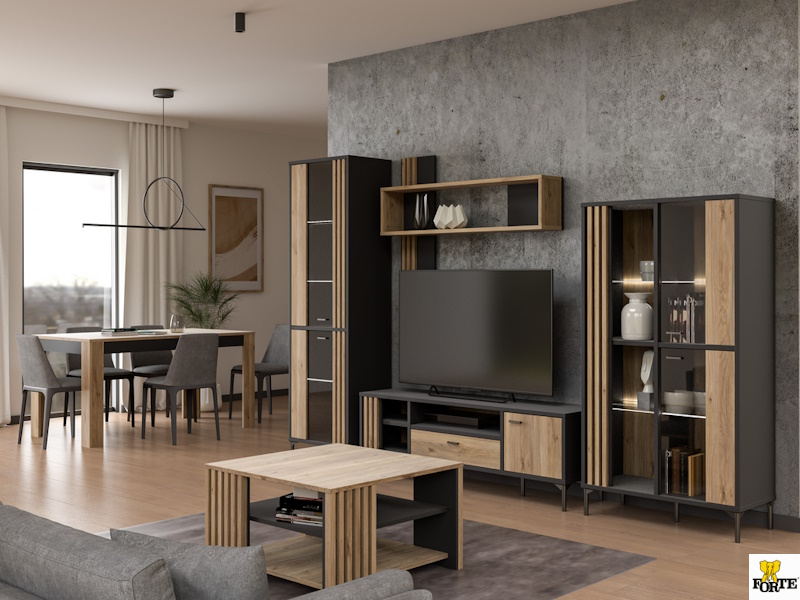 Meble łączą dekor Dąb Mauvella i Czarny, które prezentują się efektownie i elegancko. Rozbudowana kolekcja składa się z witryn, komody, szafki RTV, półki oraz szafy. Do tego masz do dyspozycji ławę oraz stół rozkładany.