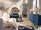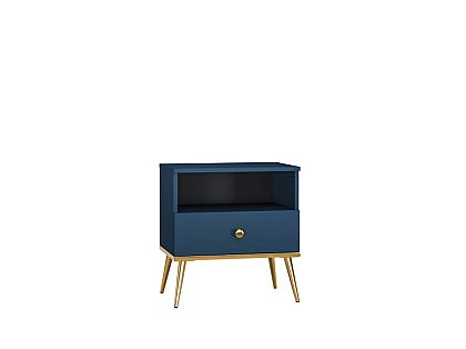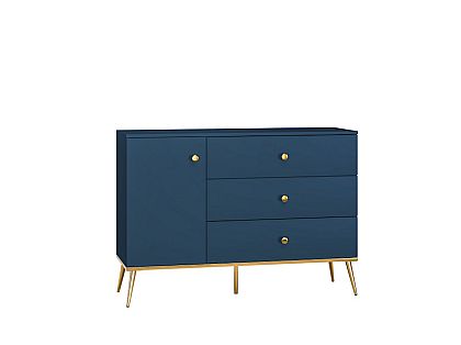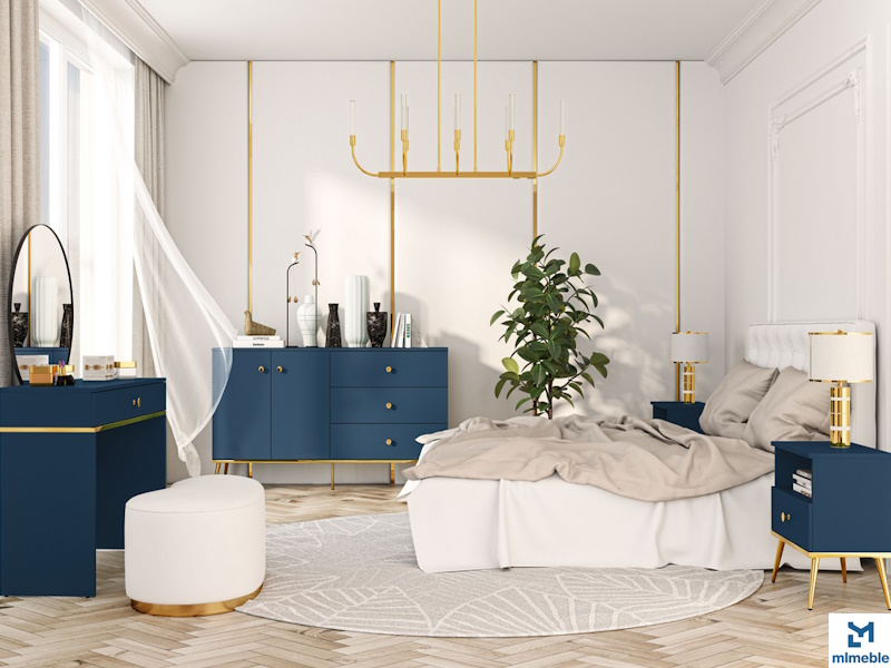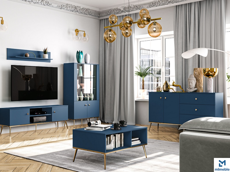 Połączenie dekoru ciemnego błękitu ze złotymi akcesoriami idealnie wpasowuje się w obowiązujące trendy. Dodatkowo meble posiadają system cichego domykania oraz metalowe nożki i uchwyty.