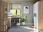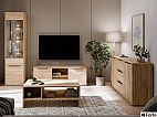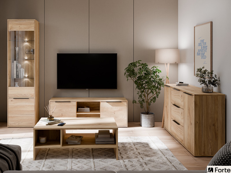 Stylowa kolekcja mebli do pokoju dziennego, dostępna w dwóch wariantach kolorystycznych: z białymi elementami lub w całości w dębowym kolorze.