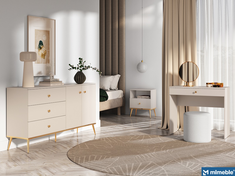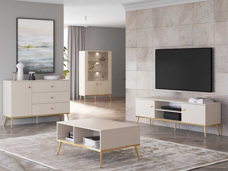 Meble z kolekcji Selgin charakteryzują się wyjątkowym designem łączącym minimalizm z wyrafinowanymi, złoconymi dodatkami. Jasnobeżowy, kaszmirowy dekor brył w połączeniu z uchwytami, nóżkami oraz okleiną wieńca dolnego w kolorze złotym doskonale wkomponuje się we współczesne wnętrze.