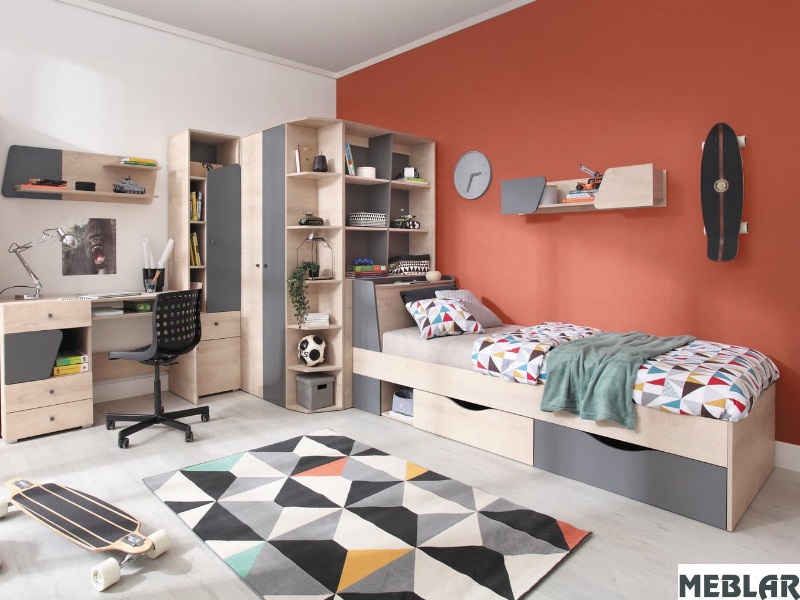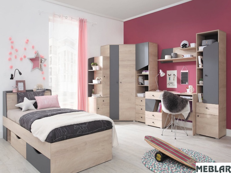 Młodzieżowy System Delta to ponadczasowa kolekcja mebli. Pozwoli na zaaranżowanie nawet najmniejszych powierzchni. System dostępny w połączeniu kolorów Dębu i Antracytu.