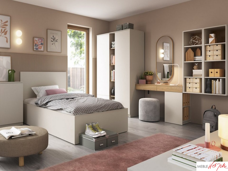 Kolekcja FANO do pokoju młodzieżowego wyróżnia się nowoczesnym minimalizmem i prostymi bryłami pozbawionymi uchwytów. Stylowe zestawienie kolorów kaszmiru z karmelowym dębem nadaje meblom uniwersalny charakter, który doskonale komponuje się z różnymi aranżacjami wnętrz.