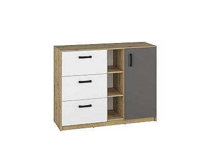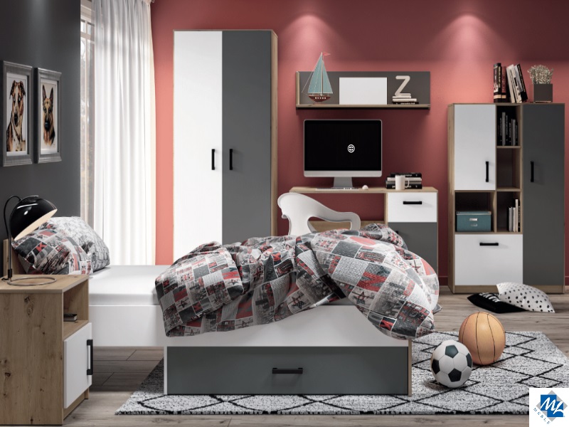 Nowoczesna i zdecydowana kombinacja kolorów - białego alpejskiego i antracytowego z klasycznie usłojonym dębem artisan - odzwierciedla dynamiczny temperament nastolatków. Geometria frontów i korpusów tworzy efekt porządku, spójności oraz młodzieżowej elegancji. Kontrastujące czarne uchwyty podkreślają nieprzeciętność mebli Fini.