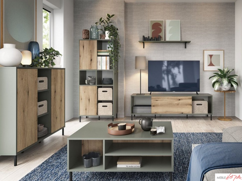 Kolekcja mebli Pozzi łączy elegancję i ponadczasowe kształty z efektownym zestawieniem szarozielonych odcieni i ryflowanych elementów w kolorze dębu. Funkcjonalne bryły na wysokich, metalowych nóżkach oraz nowoczesny mechanizm Push to open czynią ją idealnym wyborem do pokoju młodzieżowego, salonu i jadalni.