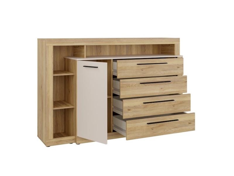 Komoda z kolekcji BELLEVUE dopełni każde mieszkanie urządzone w stylu nowoczesnym lub boho. Mebel posiada 4 szuflady, 4 otwarte wnęki i zamykaną szafkę, dzięki czemu zmieścisz wszystkie niezbędne przedmioty. Na blacie komody wyeksponujesz zdjęcia, kwiaty i pamiątki rodzinne, a całą aranżację wnętrza możesz dodatkowo uzupełnić o pozostałe elementy kolekcji BELLEVUE.