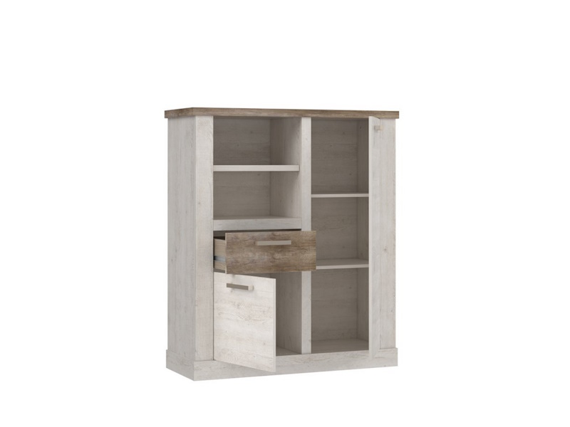 Wysoka komoda wykonana w połączeniu dwóch kontrastujących dekorów: Pinia Biała oraz Dąb Antyczny doskonale zaprezentuje się zarówno w jasnej, jak i ciemnej aranżacji wnętrza. Komoda świetnie sprawdzi się w jadalni, salonie oraz przedpokoju.