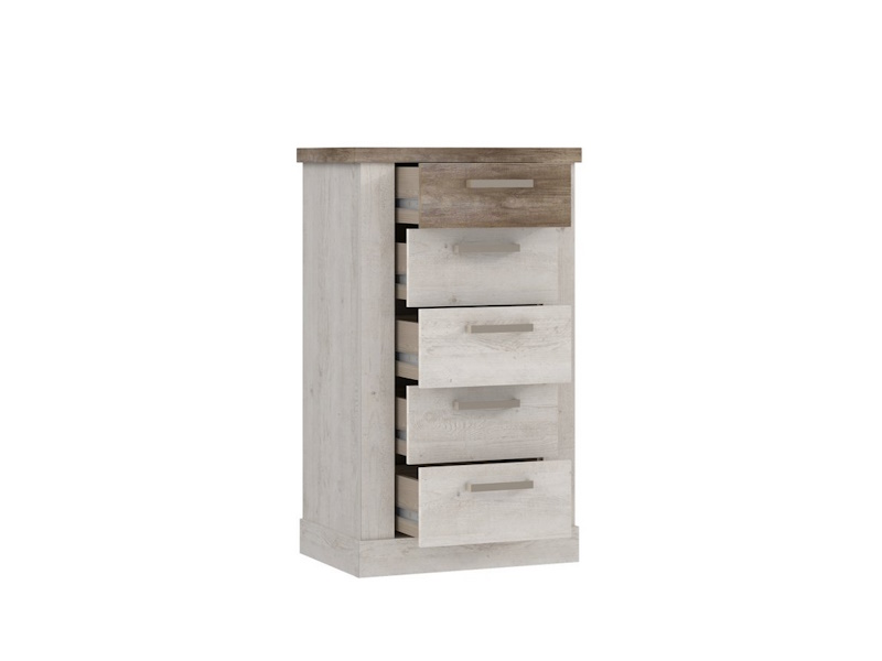 - Komoda posiada pięć pojemnych szuflad, które gwarantują odpowiednio dużo miejsca do przechowywania oraz ułatwią zachowanie porządku