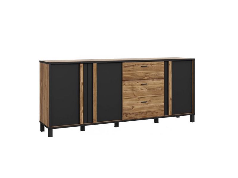 Komoda posiada dużo miejsca do przechowywania różnych rzeczy. Wykonana została w połączeniu dwóch dekorów, Czarnego i Świerku Alpejskiego, który idealnie imituje naturalne usłojenie drewna.