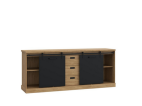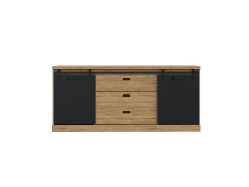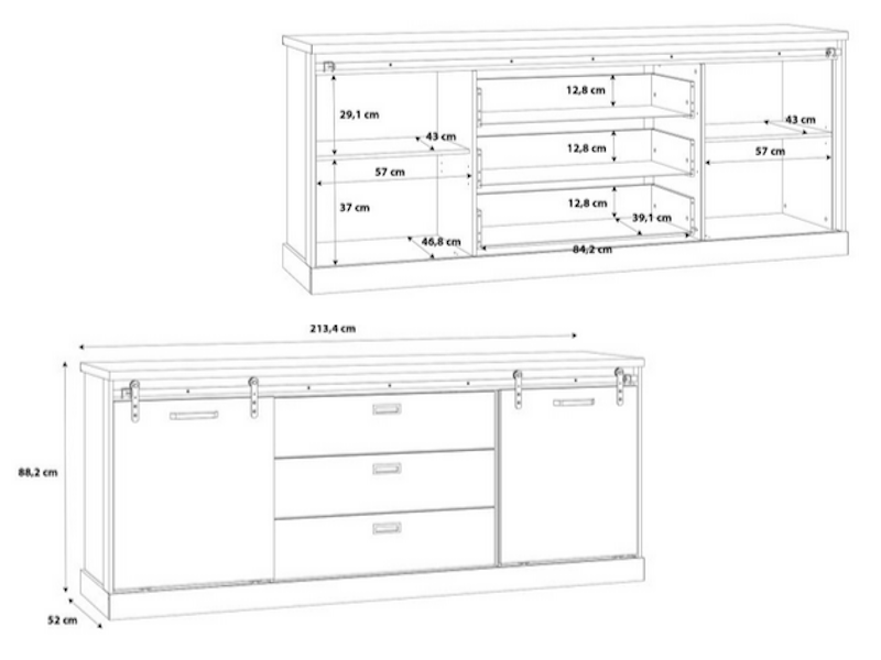 - Posiada dwie szafki z drzwiami przesuwanymi oraz trzy szuflady