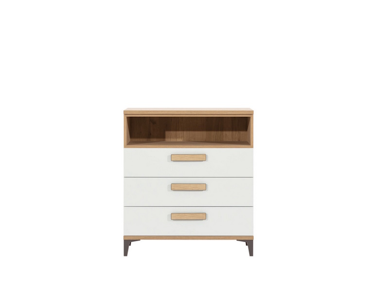 Komoda KUBO KB01 to praktyczna i pojemna komoda do pokoju młodzieżowego i nie tylko. Posiada trzy szuflady oraz otwartą wnękę i pomimo swoich niewielkich rozmiarów pomieści sporo niezbędnych przedmiotów. Ciepła kolorystyka korpusu oraz białe, błyszczące fronty rozjaśnią i optycznie powiększą przestrzeń i nadadzą przytulności pomieszczeniu. Dodatkowym atutem komody są ciemne nóżki, ułatwiające utrzymanie porządku, oraz nadające bryle lekkości. Komoda idealnie sprawdzi się w konfiguracji z innymi bryłami z serii KUBO lub jako pojedynczy mebel, który można dopasować do własnej aranżacji pomieszczenia.