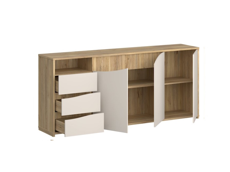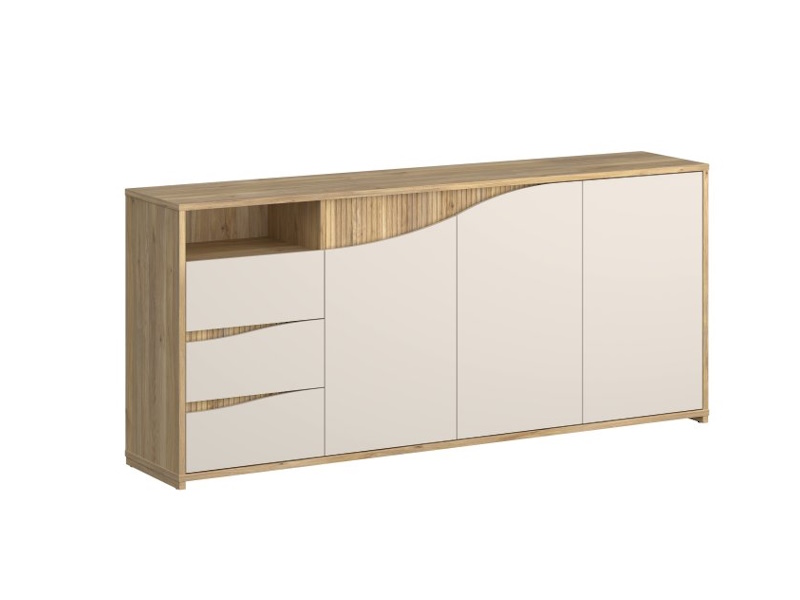 Komoda z kolekcji POEM dopełni każde mieszkanie urządzone w stylu MODERN. Mebel posiada szuflady (3) i półki (3), dzięki czemu zmieścisz wszystkie niezbędne przedmioty. Na blacie komody wyeksponujesz zdjęcia, kwiaty i pamiątki rodzinne, a całą aranżację wnętrza możesz dodatkowo uzupełnić o pozostałe elementy kolekcji POEM.