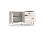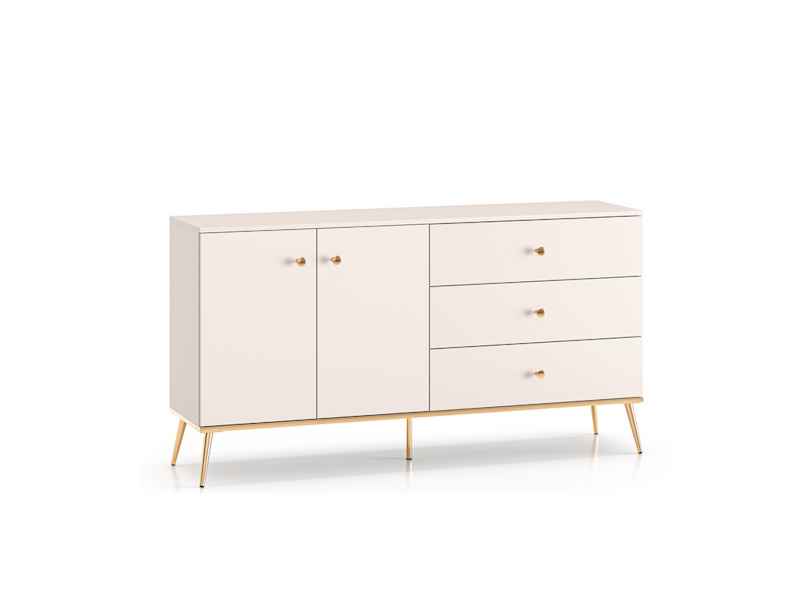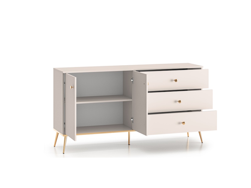 4-5 tyg.Duża komoda Selgin 03 to idealny mebel do przechowywania. Za obojgiem drzwi znajdują się półka dzieląca przestrzeń na dwie pojemne wnęki. Przechowasz w nich ubrania, ręczniki czy pościel. Środek mebla tworzą cztery głębokie szuflady, które zapewnią odpowiednią ilość miejsca na dokumenty, obrusy lub inne domowe tekstylia. Komoda będzie świetnym dopełnieniem Twojego salonu lub sypialni. Szeroki blat będzie idealnym miejscem do wyeksponowania eleganckich wazonów, pamiątek z podróży lub innych ulubionych gadżetów. Bryła mebla posadowiona jest na stabilnych, wysokich nóżkach wykonanych z wytrzymałego metalu. Podwójnie galwanizowane uchwyty oraz nogi w złotym wybarwieniu gwarantują wieloletnie, wygodne użytkowanie. Meble z kolekcji Selgin łączą w sobie wysoką funkcjonalność z zachwycającym designem.