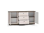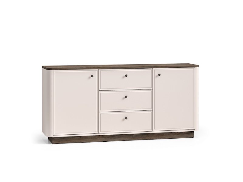 Duża komoda Vilavio 03 to idealny mebel do przechowywania. Za obojgiem drzwi kryją się łącznie cztery pojemne wnęki. Przechowasz w nich ubrania, ręczniki czy pościel. Środek mebla tworzą trzy głębokie szuflady, które zapewnią odpowiednią ilość miejsca na dokumenty, obrusy lub inne domowe tekstylia. Komoda będzie świetnym dopełnieniem Twojego salonu lub sypialni. Szeroki blat będzie idealnym miejscem do wyeksponowania eleganckich wazonów, pamiątek z podróży lub innych ulubionych gadżetów. Wybierz komodę Vilavio i zachowaj porządek w swoim wnętrzu.