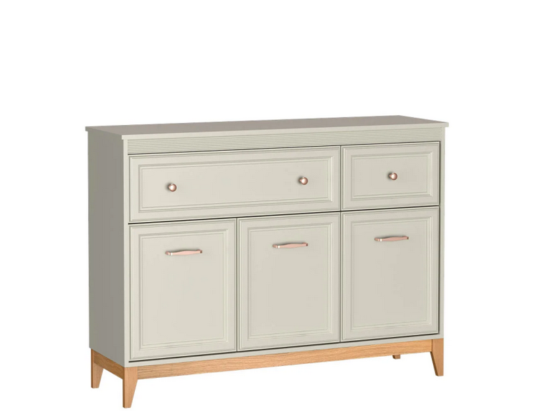 Komoda Windsor – klasyczna elegancja w odcieniu kaszmiru Szukasz mebla, który połączy ponadczasowy styl z funkcjonalnością? Komoda Windsor to kwintesencja elegancji i wyrafinowanego rzemiosła. Jej subtelny odcień kaszmiru nadaje wnętrzu lekkości i harmonii, a dekoracyjne listwy MDF na frontach podkreślają klasyczny charakter mebla.