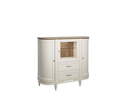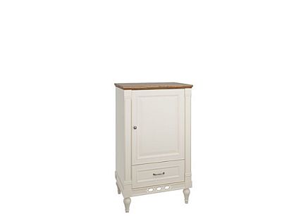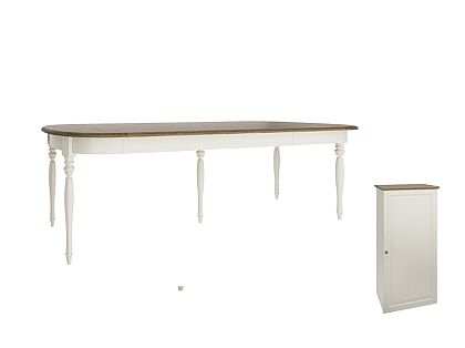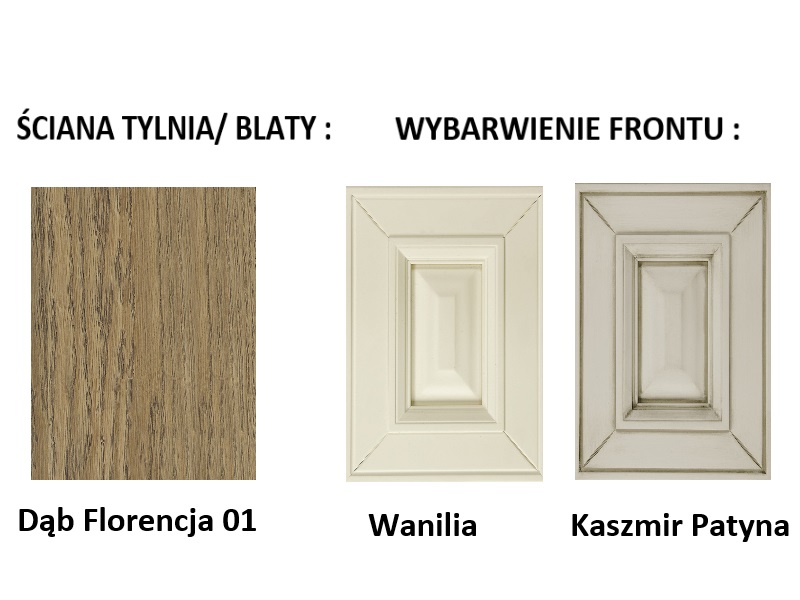 Kolorystyka kolekcji została utrzymana w jasnym odcieniu wanilii oraz w kolorze kaszmiru pokrytego patyną. Fronty wykonane z płyty pokrytej okleiną naturalną.