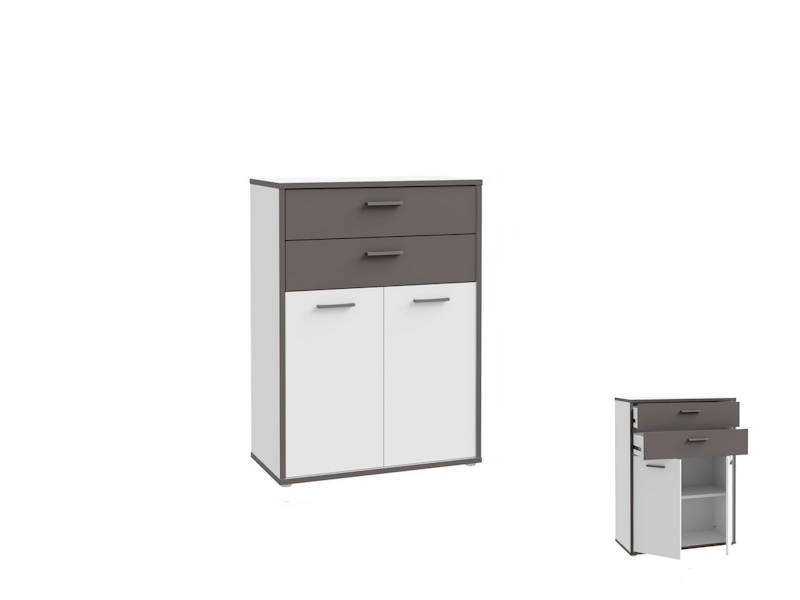 Szafka jest w Białym dekorze połączonym w ciekawy sposób z dekorem Uni Wolfram Szary