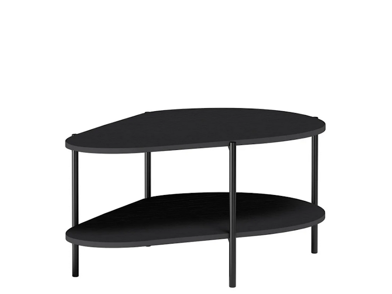 Nowoczesny stolik kawowy o organicznym kształcie i dwupoziomowej konstrukcji. Elegancka czerń, solidna metalowa rama i dodatkowa półka łączą styl z funkcjonalnością, idealnie komponując się z nowoczesnymi wnętrzami.