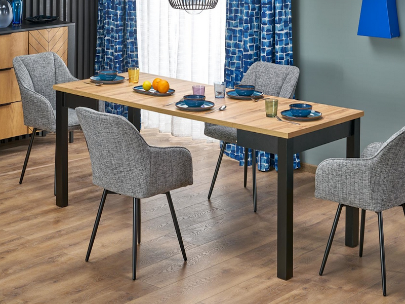 Z kolei czarne nogi stołu dodają mu nowoczesnego, minimalistycznego wyglądu, doskonale kontrastując z jasnym blatem.
