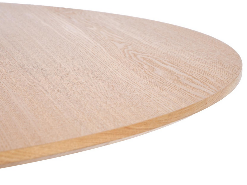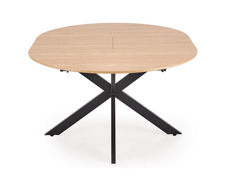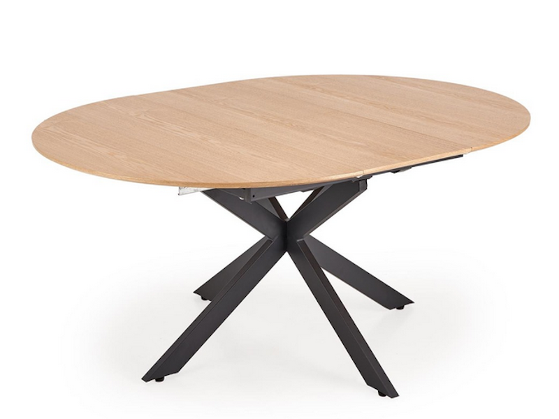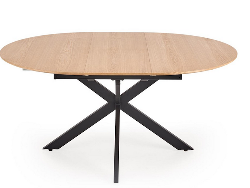 Zalety tego stołu to nie tylko jego unikalna konstrukcja, ale także materiał, z którego został wykonany. Blat z płyty MDF pokryty naturalną okleiną dodaje mu elegancji i sprawia, że pasuje do różnych stylów wnętrz, od loftowego po nowoczesny. Okrągły kształt stołu w połączeniu z funkcją rozkładania do owalu daje Ci ogromną elastyczność – świetnie sprawdzi się na co dzień, ale także w momentach, gdy będziesz go potrzebować do większych spotkań czy rodzinnych obiadów.