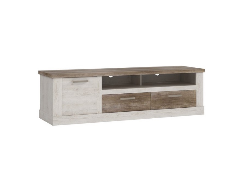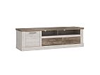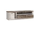 Stylowa szafka RTV w jasnym dekorze Pinia Biała i Dąb Antyczny to doskonałe uzupełnienie każdego nowoczesnego salonu. Mebel składa się z dwóch szuflad, zamykanej szafki oraz dwóch półek, które znacznie ułatwią bezpieczne przechowywanie sprzętu RTV.