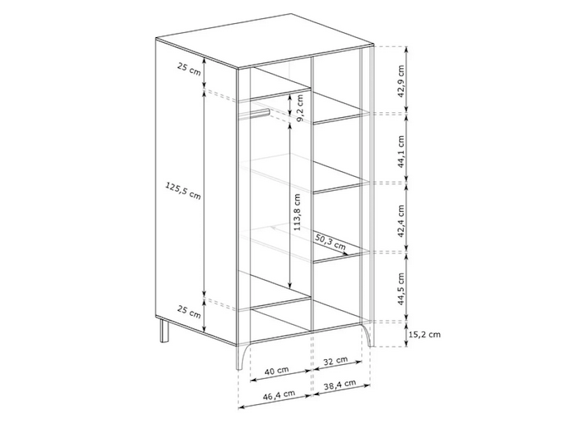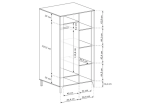 Posiada przestrzeń na wieszaki, cztery półki i dolną strefę na buty czy torby.