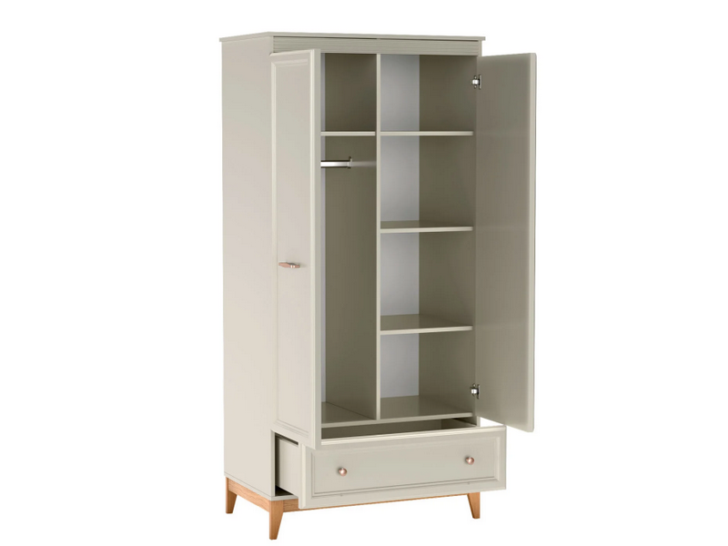 Szafa WINDSOR – 10 to eleganckie i funkcjonalne rozwiązanie do każdego wnętrza. Jej klasyczna forma, jasna kolorystyka oraz drewniane akcenty sprawiają, że doskonale wpisuje się zarówno w styl klasyczny, jak i skandynawski.