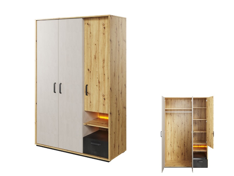 Szafa trzydrzwiowa z drążkiem, szafką z półkami, szufladą, dwiema wnękami oraz oświetleniem ledowym