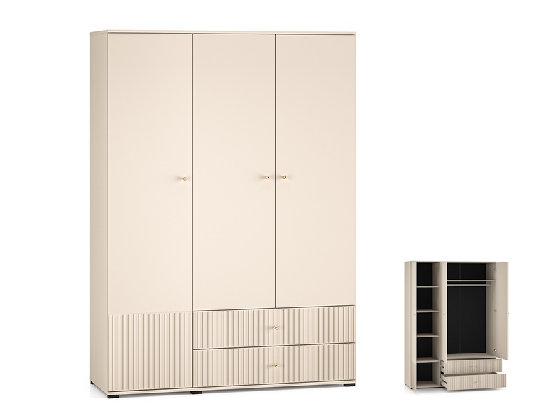 4-5 tyg.Szafa Sophie 22 to mebel, w którym przechowasz swoją odzież i dodatki. Bryła podzielona jest na trzy funkcjonalne strefy. Główną część tworzy duża przestrzeń z solidnym drążkiem, na którym powiesisz koszule, garsonki czy garnitury. Nad drążkiem znajduje się szeroka półka na kapelusze czy inne tekstylia. Lewa strona mebla składa się z pięciu pojemnych wnęk, w których, w uporządkowany sposób, przechowasz swoje ubrania lub inne przedmioty. Dolna część szafy to dwie duże szuflady, idealne na bieliznę czy skarpety. Design mebla Sophie 22 to synonim współczesnej elegancji. Kaszmirowy dekor, frezowane fronty MDF, metalowe gałki w kolorze szczotkowanego złota oraz dyskretne czarne nóżki to kwintesencja całej kolekcji Sophie.