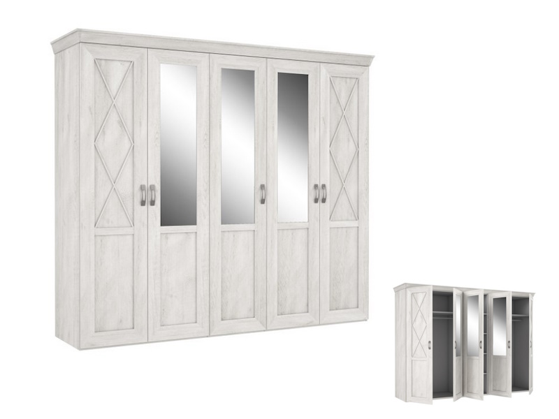 Pięciodrzwiowa, stylizowana szafa spełni funkcję sypialnianej garderoby. Bogate zdobienia, ramkowe fronty, szprosy przywodzą na myśl meble z poprzednich epok. Szafa została podzielona na trzy części - dwie zewnętrzne są wyposażone w drążek na ubrania i górną półkę natomiast wąska, środkowa pełni funkcję bieliźniarki.