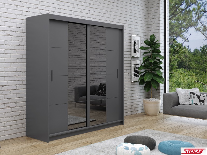 Nowoczesna szafa z centralnie umieszczonym dekorem grafiwowego lustra.