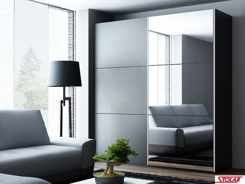 Zgrabna, proporcjonalna bryła, duże lustro oraz poziomy trójpodział powierzchni drzwi dodaje szafie współczesnego charakteru.