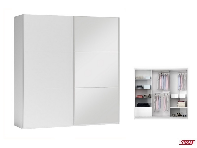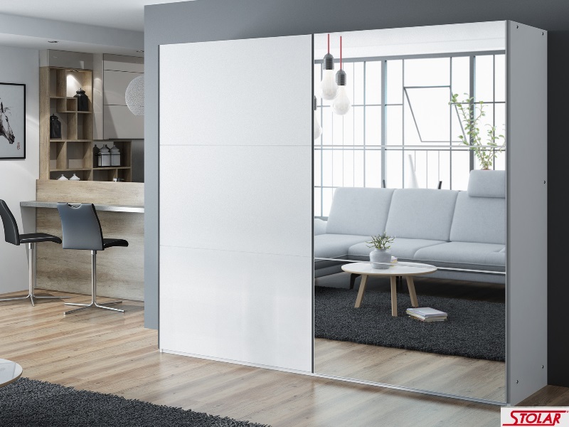 Zgrabna, proporcjonalna bryła, duże lustro oraz poziomy trójpodział powierzchni drzwi dodaje szafie współczesnego charakteru.