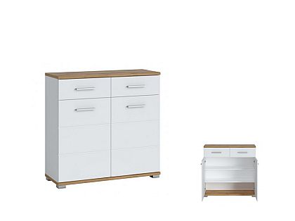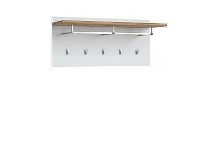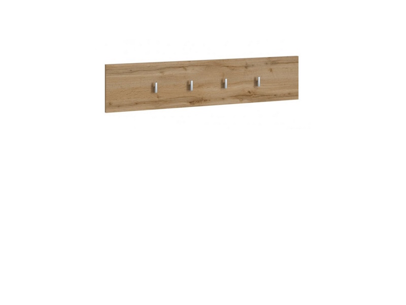 Panel ścienny do której zamocowane są cztery haczyki/wieszaki zaskakuje funkcjonalnością. Solidnie wykonana półka ścienna do samodzielnego montażu powstała z płyty wiórowej laminowanej w odcieniu Dąb Wotan. Łatwo utrzymać ją w czystości i dopasować do pozostałych mebli z kolekcji. Wieszaki wykonano z tworzywa sztucznego. Prezentujące minimalistyczną stylistykę wieszaki posłużą do utrzymania ciężaru okryć wierzchnich całej rodziny, torebek i niewielkich plecaków.