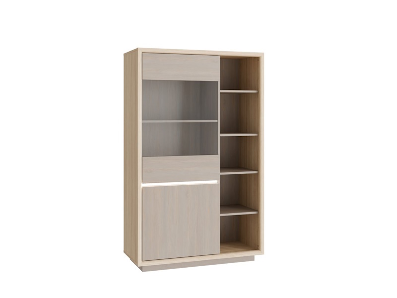 Witryna z kolekcji FICAR świetnie wyeksponuje Twoje ulubione książki, pamiątki oraz dekoracje. Pomogą w tym (4) regulowane półki, (3) półki montowane na stałe i (5) otwartych wnęk. n/a. Mebel wyposażony w transparentne, bezpieczne szkło hartowane.2-drzwiowa witryna doskonale wygląda zestawiona z pozostałymi elementami z kolekcji, tworząc wymarzoną aranżację salonu.