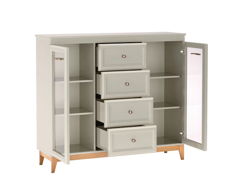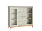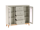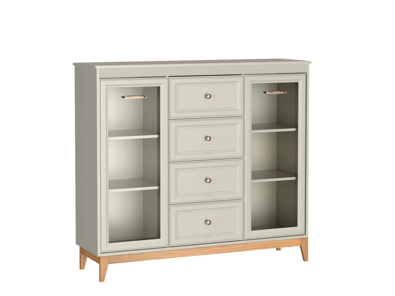WINDSOR – 7 to elegancka i funkcjonalna witryna, która łączy klasyczną estetykę z nowoczesnymi rozwiązaniami. Jej subtelna kolorystyka w odcieniu kaszmiru, zestawiona z drewnianymi akcentami, tworzy harmonijną i przytulną atmosferę w każdym wnętrzu. Dzięki przemyślanemu układowi oraz wysokiej jakości wykonaniu, witryna doskonale sprawdzi się w salonie, jadalni czy gabinecie, pełniąc zarówno funkcję dekoracyjną, jak i praktyczną.