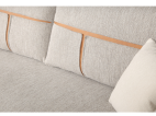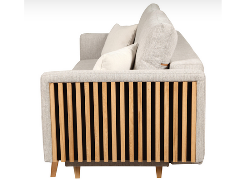 Klasyczna kanapa posiadająca wstawki w boku z lameli w kolorze dębu.